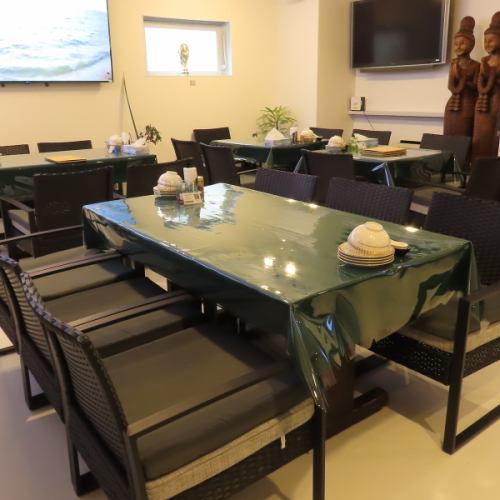 창가에 늘어선 테이블을 연결하면 12분 걸이의 긴 테이블이 되어, 연회도 대응 가능합니다.예약 받습니다.